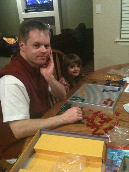 Our princess she may be but our girl has an pretty savy analytical side to her. She can beat me cold at Memory and loves the game Blockus which was intended for her older brother but that she has usurped due to his lack of interest. I love seeing both sides of her - as different as they are. The side that loves cooking, baby dolls, dress up, and bows, and the side that loves problem solving, playing strategy games, and declares, "Mommy, I can do it myself!". Below is a picture I snapped of her & her daddy playing Blockus long after the other kids had gone to bed.